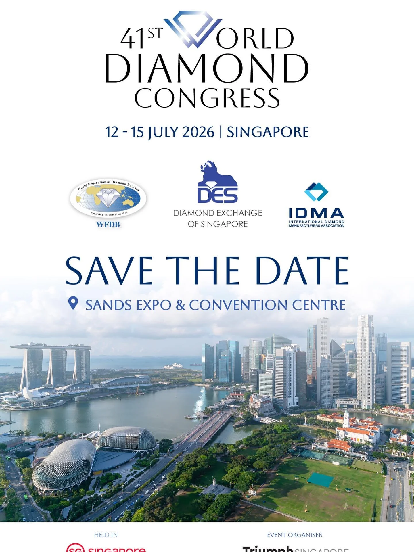 Singapore, October 26, 2025 - The next World Diamond Congress, a joint assembly of the World Federation of Diamond Bourses (WFDB) and the International Diamond Manufacturers Association (IDMA), will be held July 12-15, 2026, at the Sands Expo & Convention Centre.