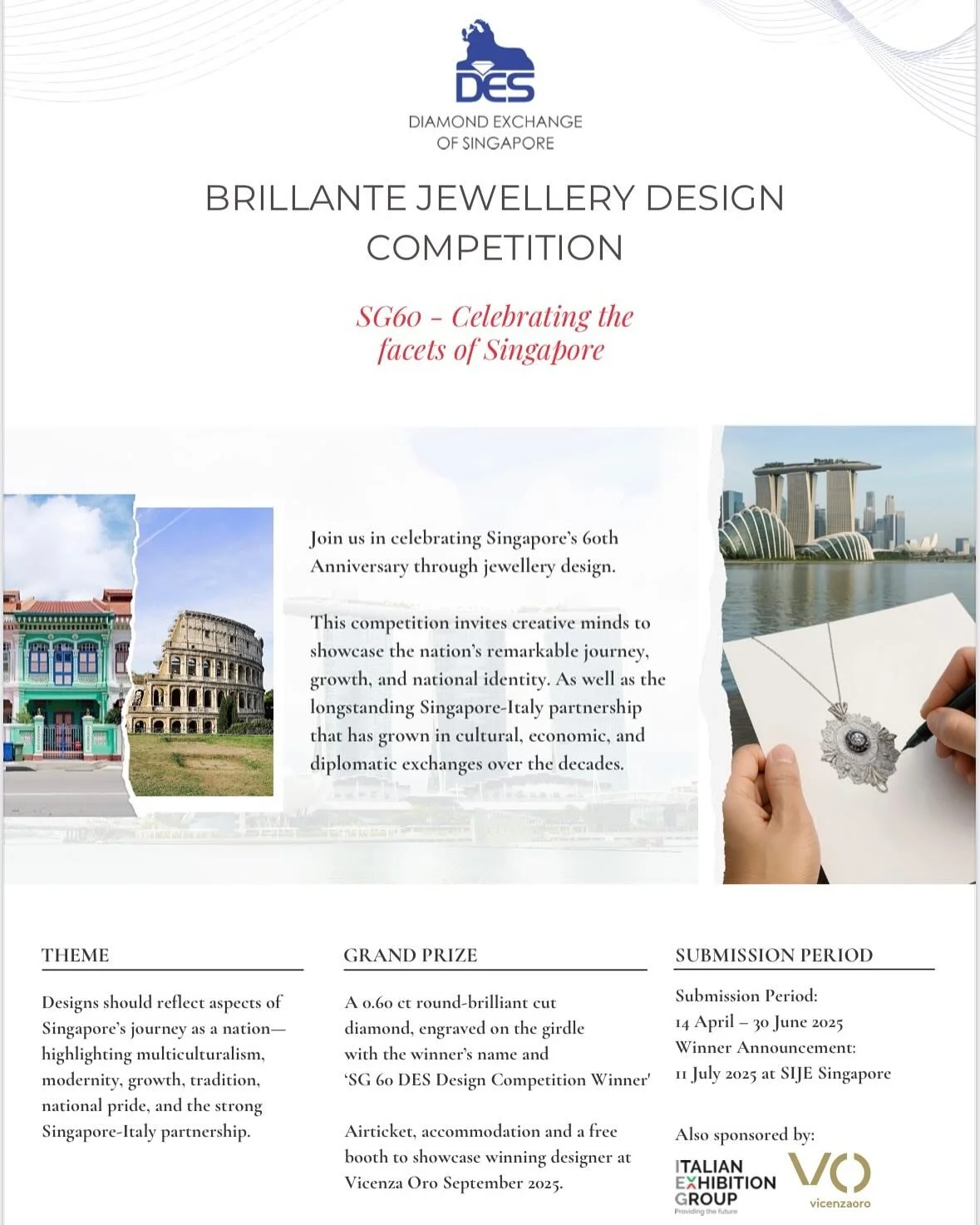 The SG60 Brillante Jewellery Design Competition celebrates Singapore's 60th Anniversary through jewellery design. This competition invites creative minds to showcase the nation’s remarkable journey, growth, and national identity. It also celebrates the longstanding Singapore-Italy partnership that has grown in cultural, economic, and diplomatic exchanges over the decades.
